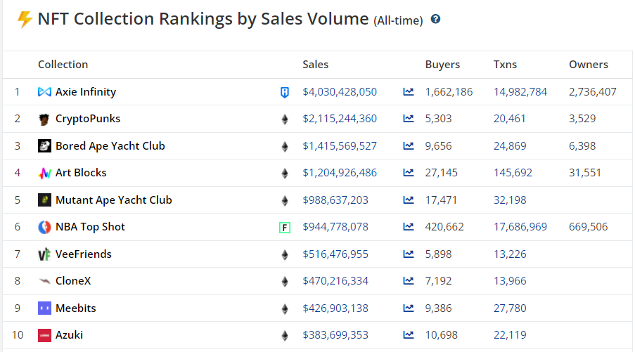 По данным CryptoSlam, NFT из коллекций CryptoPunks и BAYC являются одними из самых востребованных на рынке. Совокупный объем продаж первой составляет $2,11 млрд, второй — $1,41 млрд. Лидирует в секторе P2E-игра Axie Infinity — ее показатель превышает $4 млрд.