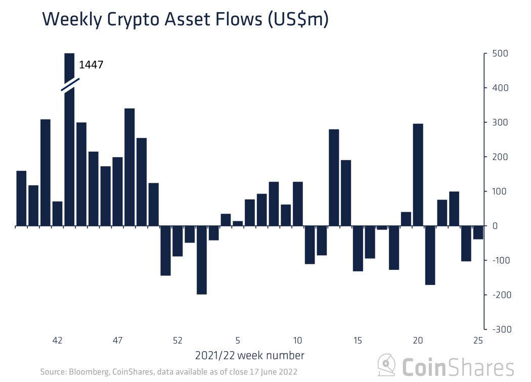 В исследовании компании CoinShares говорится, что общая сумма средств, находящихся в криптофондах, упала до самого низкого уровня с зимы прошлого года.