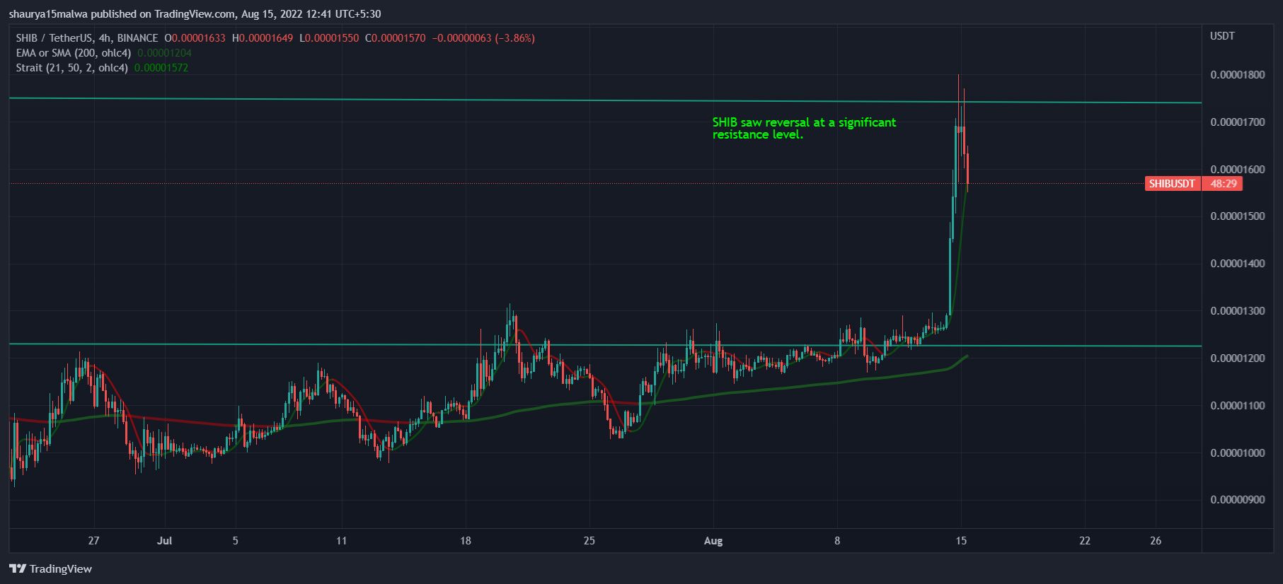 SHIB и DOGE взлетели до $0,00001744 и $0,0838. Однако удержать позиции эти токены не смогли, так как после достижения пиковых значений активизировались продавцы, устроившие массированный сброс криптовалют в ночь на понедельник, 15 августа.