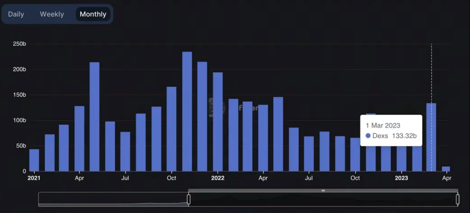 По данным сервиса DeFiLlama, сумма сделок на DEX-платформах достигла $133,1 млрд в месячном выражении.