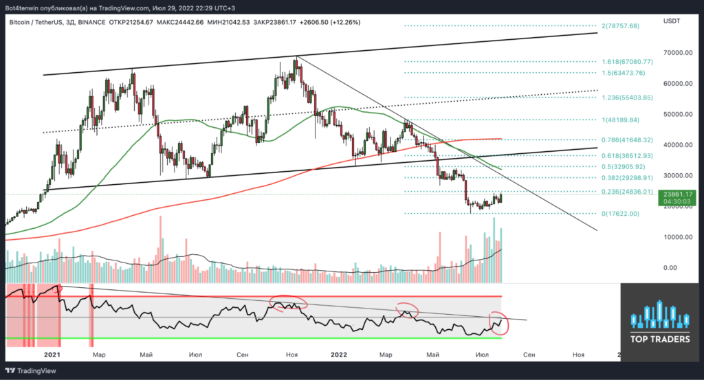 3D-таймфрейм примечателен трендовой линией на RSI от 7 января 2021 года. Важно внимательно следить за реакцией цены на трендовую — пробой будет дополнительным бычьим сигналом.