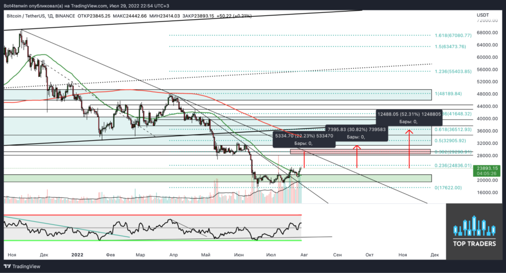 Дневной таймфрейм тоже указывает на вероятный отскок. Первые цели — диапазон $28 600–$30 000. В случае закрепления следующим уровнем станет ретест нижней границы активной зоны торгов — $31 300.