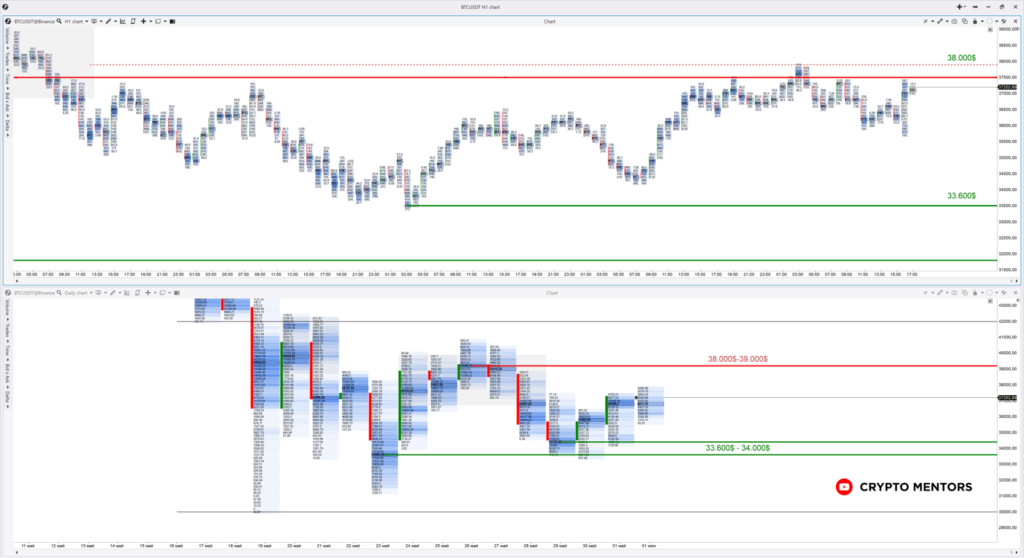 Теперь разберемся со значимыми уровнями. Кластерный анализ показывает распределение останавливающих объемов в диапазоне $38 000-$39 000. Следовательно, эта зона будет выступать в качестве сопротивления.