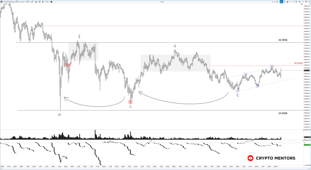 Отсутствие адекватного возобновления спроса из объемного массива покупателя в районе $34 000. Поскольку не наблюдается никакой инициирующей активности со стороны быков после серьезной атаки продаж, можно предположить, что выход из сформированного диапазона будет вниз.