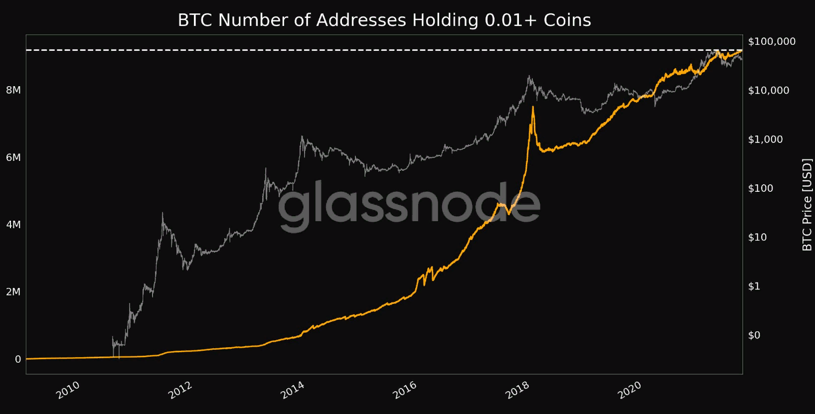 Накоплением занимаются практически все категории инвесторов. В отчете Glassnode, опубликованном накануне вечером, говорится, что число биткоин-адресов, содержащих не менее 0,01 BTC, установило новый рекорд (9,172 млн).