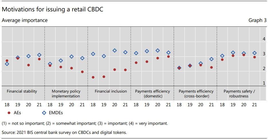 В BIS отметили, что регуляторы развитых (AEs) и развивающихся (EMDEs) экономик имеют разную мотивацию для разработки розничных CBDC. Первых в большей мере интересует повышение эффективности внутренних платежей и их безопасность, а также финансовая стабильность.