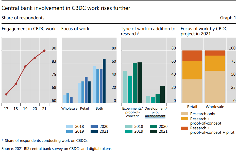 Work on retail #CBDC in advanced economies focuses mainly on improving domestic payments efficiency, safety and financial stability; emerging market and developing economies also emphasise boosting financial inclusion Gaining momentum – Results of the 2021 BIS survey on central bank digital currencies pic.twitter.com/GKz9pbNA8Q