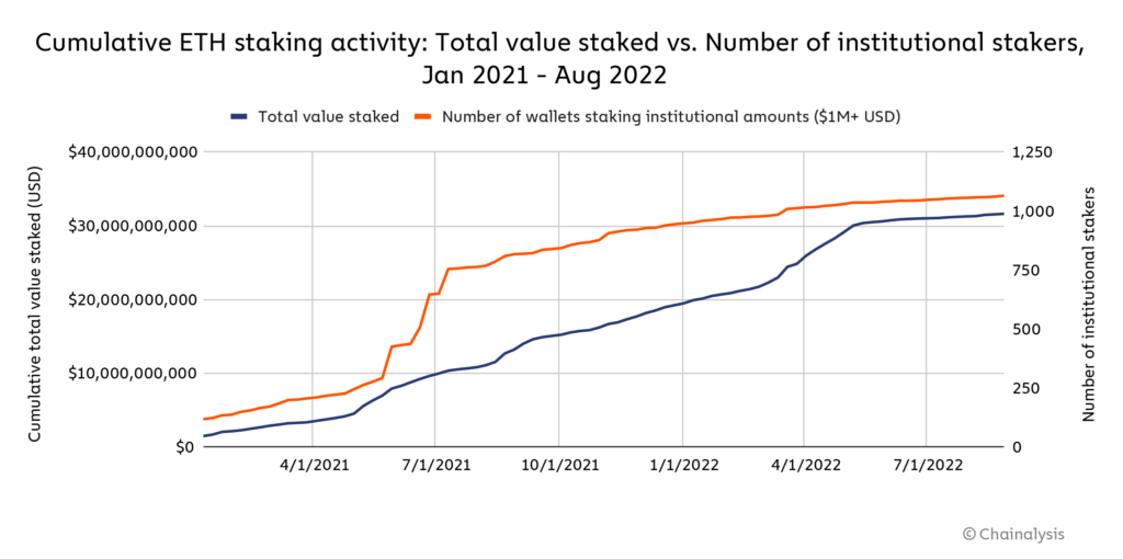 Согласно Chainalysis, число институциональных инвесторов Ethereum (c балансами более $1 млн в эквиваленте ETH) «неуклонно растет» — с менее чем 200 в январе 2021 года до ~1100 к августу этого года.