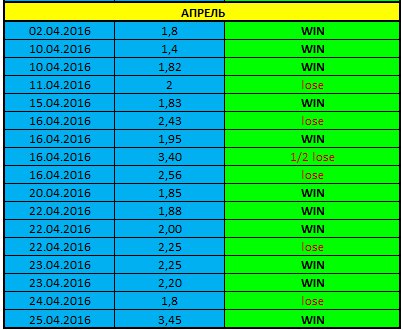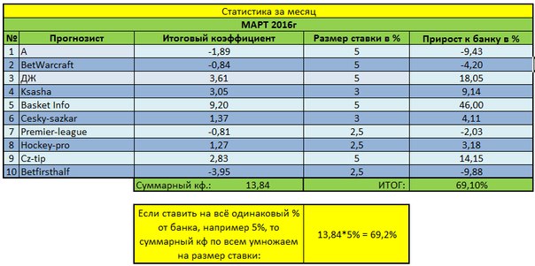 В итоге за март мы получили 69% прироста к банку. Всю малину нам подосрал Бетфёрстхалф, ресурс под номером 10. Который начал исполнять полную херню и давать на удачу, он удалён с позором из нашего списка прогнозистов. Но многие во время тормознули с ним и не ставили, это радует.