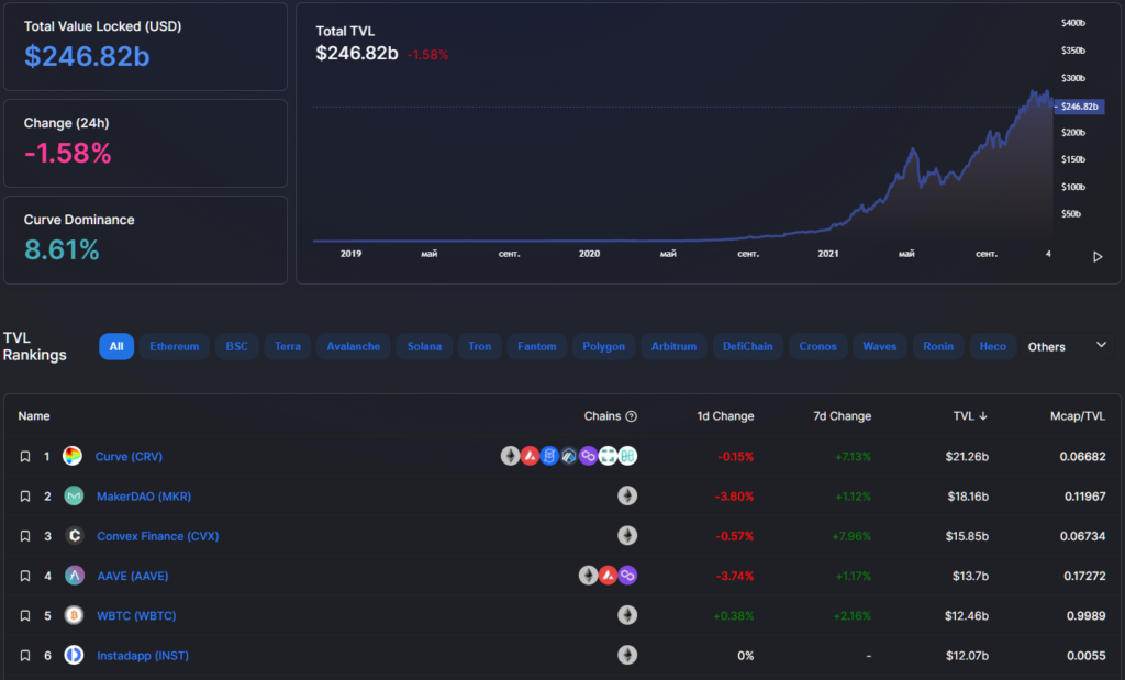 На фоне коррекции рынка объем заблокированных средств (TVL) в DeFi-протоколах снизился до $246,82 млрд. Лидерство по-прежнему удерживает протокол Curve Finance — его показатель вырос до $21,26 млрд. MakerDAO ($18,16 млрд) занял вторую строчку рейтинга, Convex Finance ($15,85 млрд) — третью.