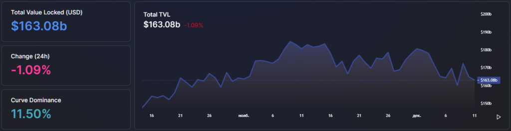 TVL в Ethereum-приложениях увеличился до $163,08 млрд. За последние 30 дней показатель снизился на 11% (11 ноября значение составило $180,65 млрд).