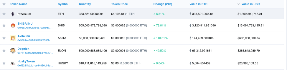 Всего в кошельке Бутерина хранится более 1000 токенов. В топе в денежном выражении — Akita Inu ($606 млн), Dogelon ($265 млн) и HuskyToken ($20 млн).