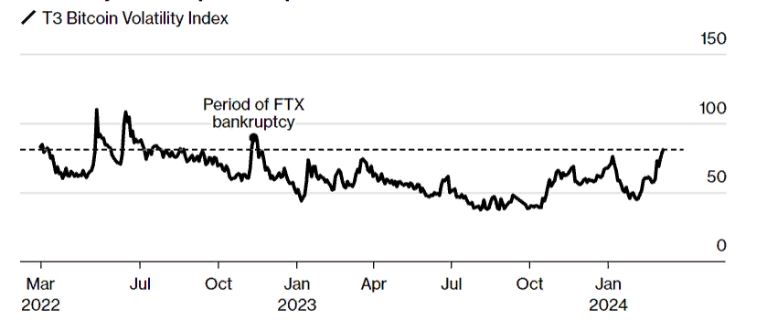 По данным Bloomberg, волатильность биткоина (BTC) достигла самого высокого уровня с момента крушения биржи FTX в ноябре 2022 года.
