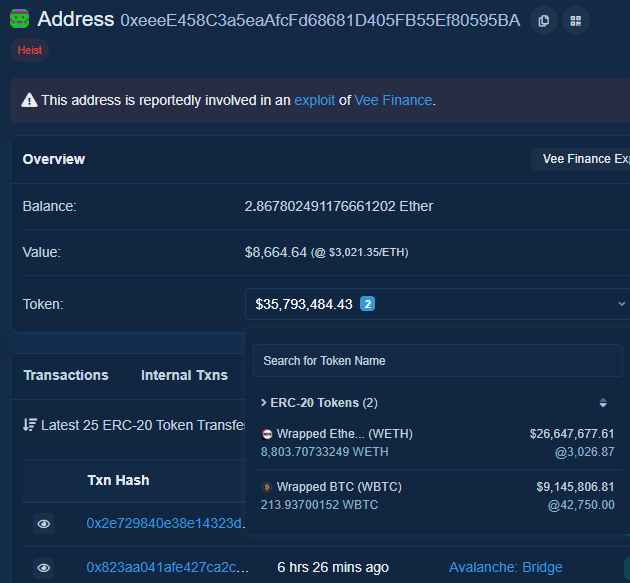 Согласно информации в блоге Vee.Finance, общая стоимость похищенных активов превысила $35 млн (8804,7 WETH и 213,93 WBTC). Хакер еще не вывел средства на сторонние платформы. Команда DeFi-проекта пытается связаться со злоумышленником в надежде вернуть активы.
