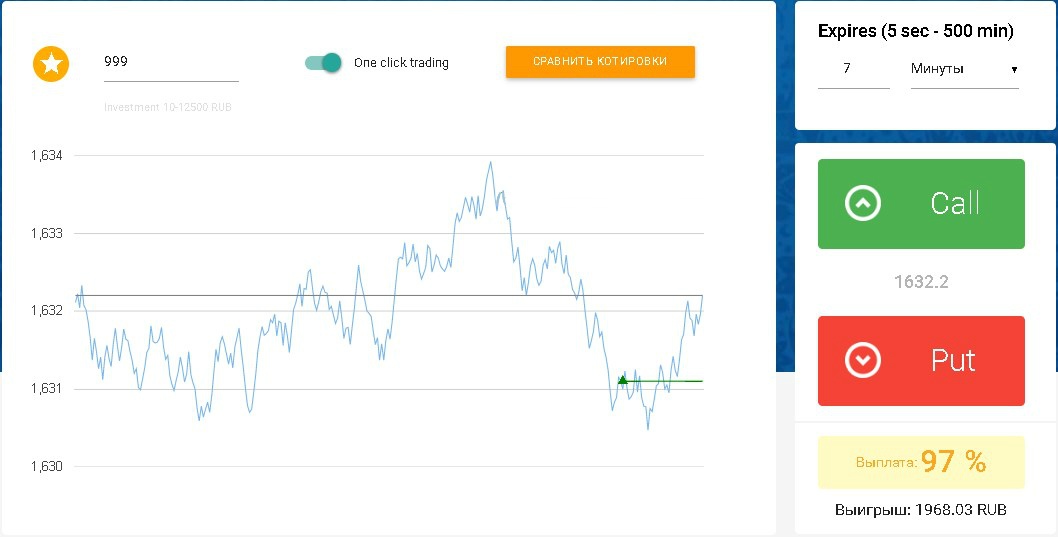 В общем завел и через пару дней не стал больше торговать. Вывели остатки быстро. Не понравилось. Очень часто когда хочу купить опцион у меня выскакивает какая то ошибка, потом выясняется,что опцион куплен, но не понятно когда, и если опцион закрывается пинбаром ( как у меня это было) то скорее всего в минус. по сравнению с Биномо и олимптрейд задержка покупки опциона ооочень ощутима.Понравился стабильный процент. Сам интерфейс. В общем не сложилось у меня с вами.Дорабатывайте платформу, " сыровата " ёщё.