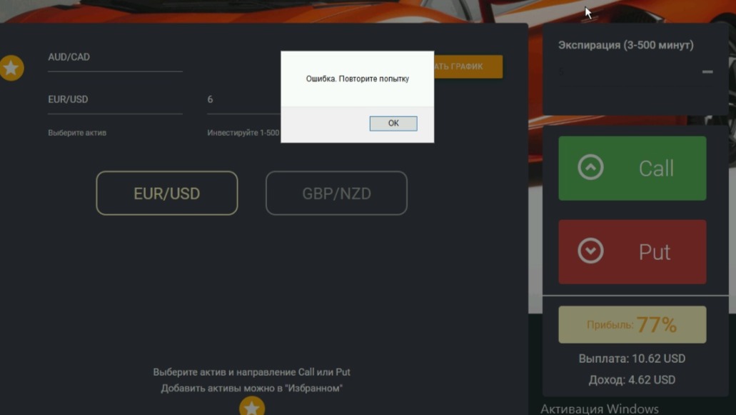 В общем завел и через пару дней не стал больше торговать. Вывели остатки быстро. Не понравилось. Очень часто когда хочу купить опцион у меня выскакивает какая то ошибка, потом выясняется,что опцион куплен, но не понятно когда, и если опцион закрывается пинбаром ( как у меня это было) то скорее всего в минус. по сравнению с Биномо и олимптрейд задержка покупки опциона ооочень ощутима.Понравился стабильный процент. Сам интерфейс. В общем не сложилось у меня с вами.Дорабатывайте платформу, " сыровата " ёщё.