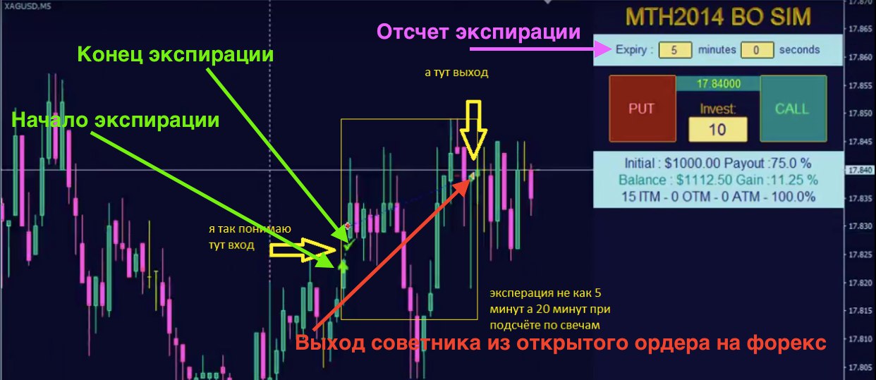 Экспирация 5 минут. Это как понимать с видео? В видео и сделки показаны не верно. Речь о 5 минутной экспирации советником. а на видео он открывает и закрывает ордера через 20 свечей. Соответственно он ни как не может работать на БО по 5 минут.и показывать правильную статистику.