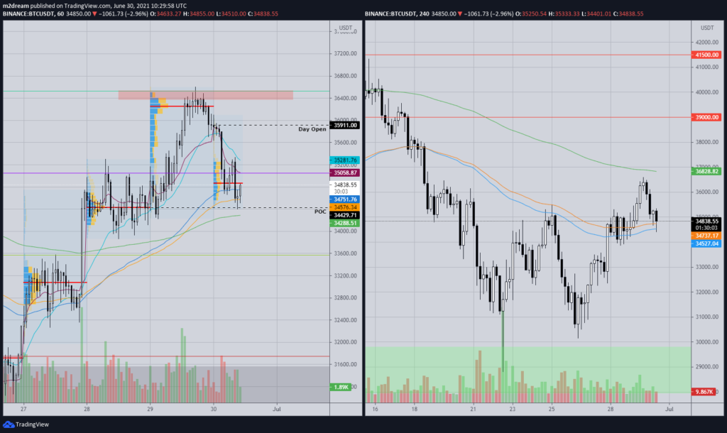 На часовом таймфрейме цена BTC протестировала уровень POC понедельника ($34 400) и пока пробует отскочить. Если продавцы продавят цену ниже, следующей локальной поддержкой будет $34 000-$33 500.