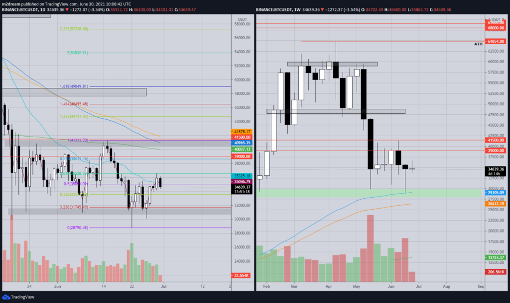 На прошлой неделе цена биткоина установила новый локальный минимум в $28 805. Однако недельная свеча BTC/USDT закрылась пинбаром по $34 700, несмотря на отключение майнеров в Китае, что свидетельствует о позитивной динамике.