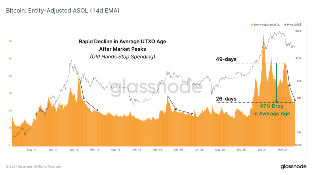 Аналитики провели параллели с 2017 и 2019 годами и обнаружили резкое снижение среднего возраста потраченных UTXO. По их словам, это указывает на возвращение к модели накопления и удержания монет, но требует подтверждения на более длительной дистанции.