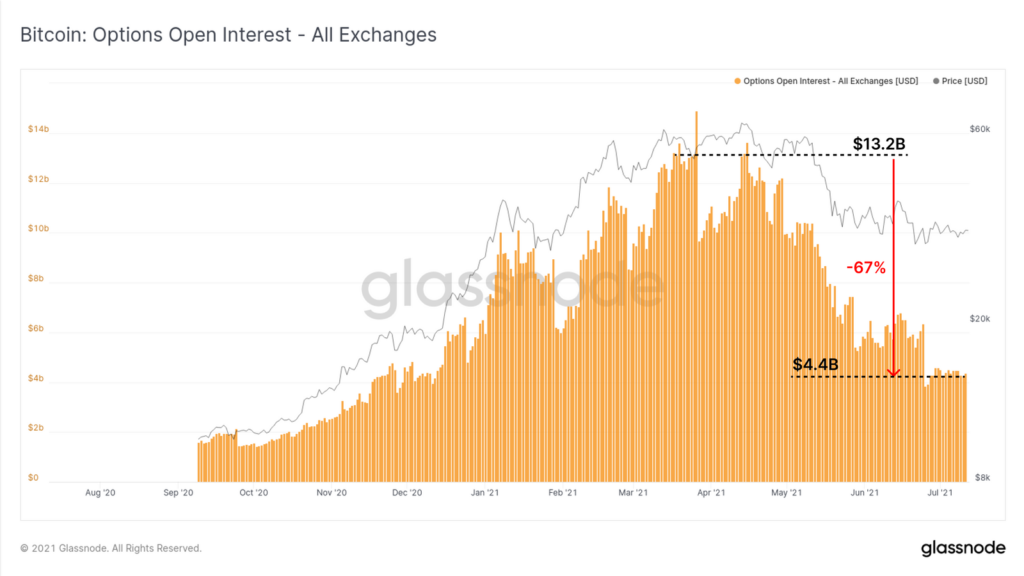 Открытый интерес по биткоин-опционам на 67% ниже ATH. Текущий показатель в $4,4 млрд соответствует значениям декабря 2020 года.