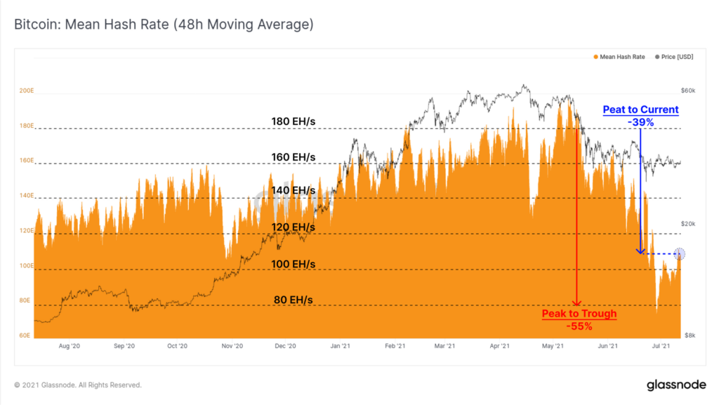 Двухдневная скользящая средняя показателя хешрейта выросла и в настоящий момент он опустился от ATH на 39% после снижения на 55% в конце июня.