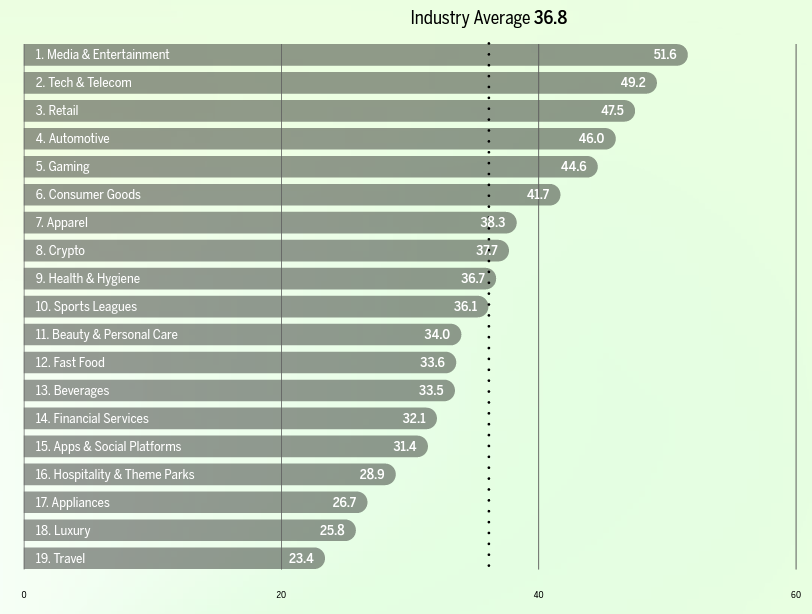 Криптовалюты заняли восьмое место по суммарному количеству баллов. Выше — медиа и развлечения, технологии и телекоммуникации, сети розничных магазинов, автомобили, игры, потребительские товары и одежда.