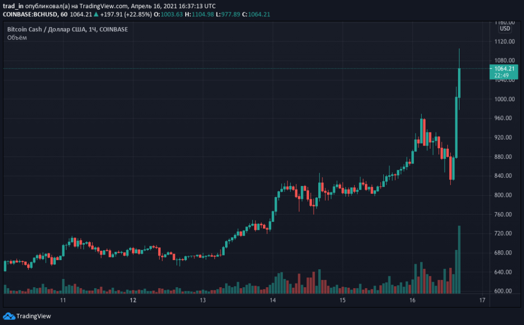 На момент написания BCH торгуется на уровне $1080. За последние сутки актив вырос на 25,4%, за семь дней — на 63,8%, согласно CoinGecko.