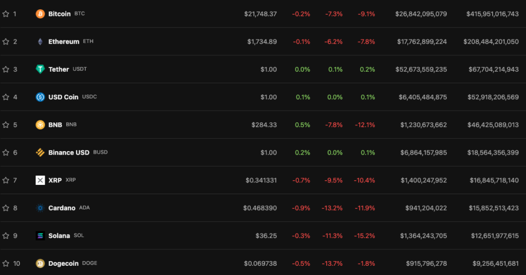 Криптоактивы из топ-10 по капитализации перешли в красную зону вслед за флагманами, за исключением стейблкоинов. Наибольшее падение демонстрируют Cardano и Dogecoin — 13,2% и 13,7% соответственно.