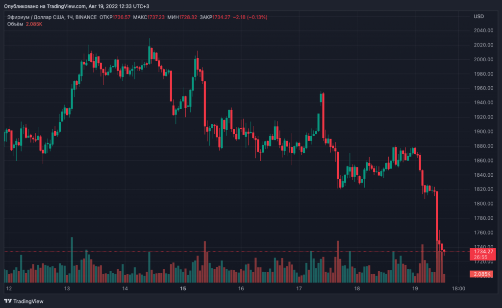 Цена Ethereum откатилась от знакового уровня в $2000, достигнутого 13 августа на фоне новостей о завершении перехода тестовой сети Goerli на алгоритм консенсуса Proof-of-Stake.