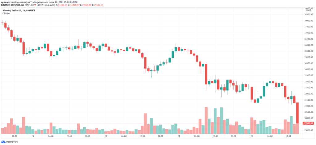 Во вторник, 22 июня, котировки первой криптовалюты опустились ниже уровня $30 000. За последние сутки актив подешевел на 7%, по данным CoinGecko.