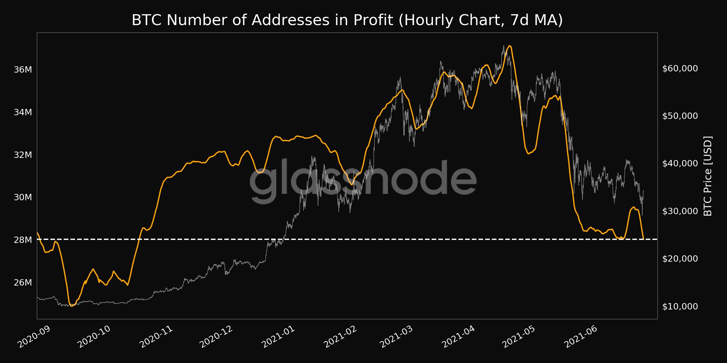 В отчете Glassnode, опубликованном еще в конце прошлого месяца, говорилось, что число прибыльных адресов в сети упало до самого низкого уровня с октября прошлого года (чуть более 28,019 млн).