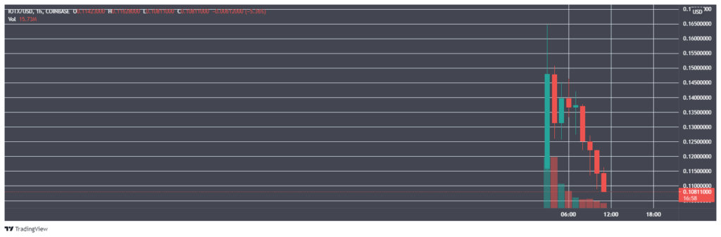 После начала торгов на Coinbase котировки токена платформы IoTeX, предназначенной для подключения устройств "Интернета вещей" и децентрализованных приложений, подскочили почти на 42%. Курс IOTX с цены открытия $0,116 в моменте достиг $0,165. Однако в ходе последовавшего падения курс актива снизился до $0,108 на момент написания.