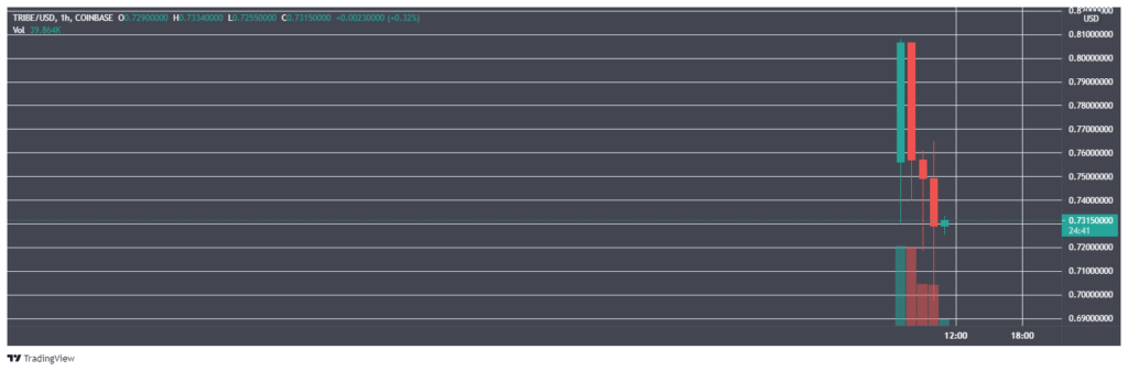Tribe (TRIBE) является токеном управления протоколом Fei, который выпускает привязанный к доллару децентрализованный стейблкоин под названием FEI. Цена TRIBE на Coinbase последовала по уже описанной траектории — рост с $0,756 до $0,808, а затем коррекция. На момент написания котировки находятся около отметки $0,73 ниже цены открытия.