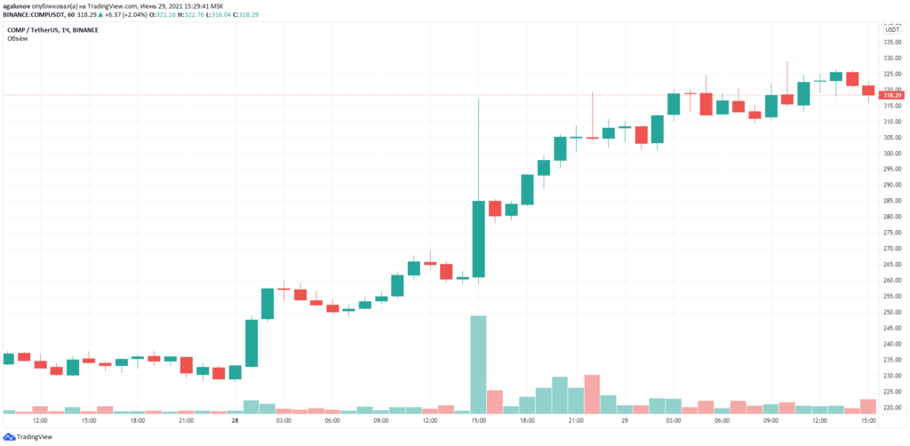 За последние сутки цена COMP выросла почти на 14%, по данным CoinGecko. На момент написания токен торгуется на отметке $318.