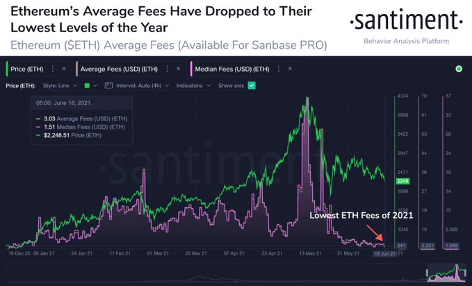 Команда Santiment также указывает на риски более глубокой коррекции, если ETH не удержится выша $2200. Параллельно аналитики отметили, что ослабление транзакционной активности в сети спровоцировало резкое падение эфириум-комиссий до $3,03.