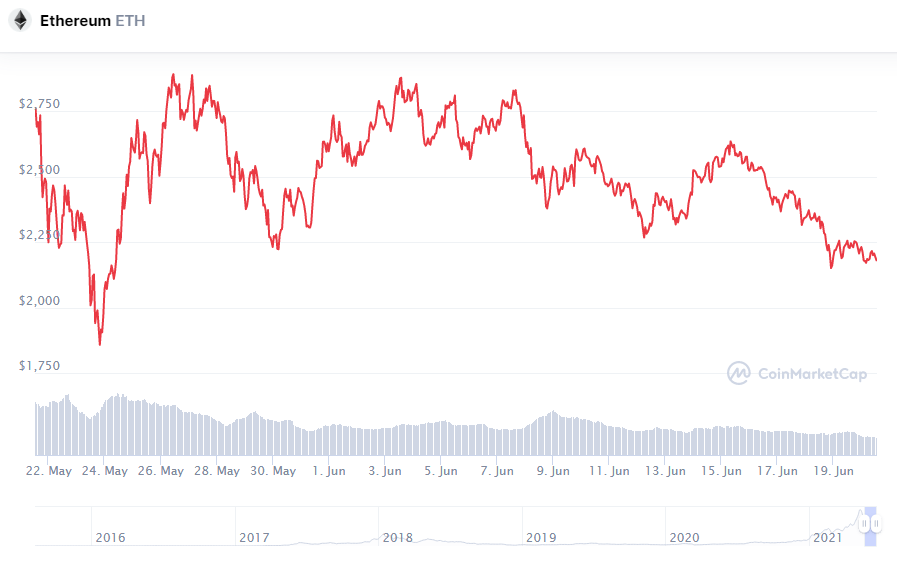 Крупнейший альткоин эфир (ETH) в воскресенье, 20 июня, торгуется на уровне $2190. За последние сутки монета потеряла в стоимости почти 3%, капитализация ETH сократилась до $257,394 млрд.