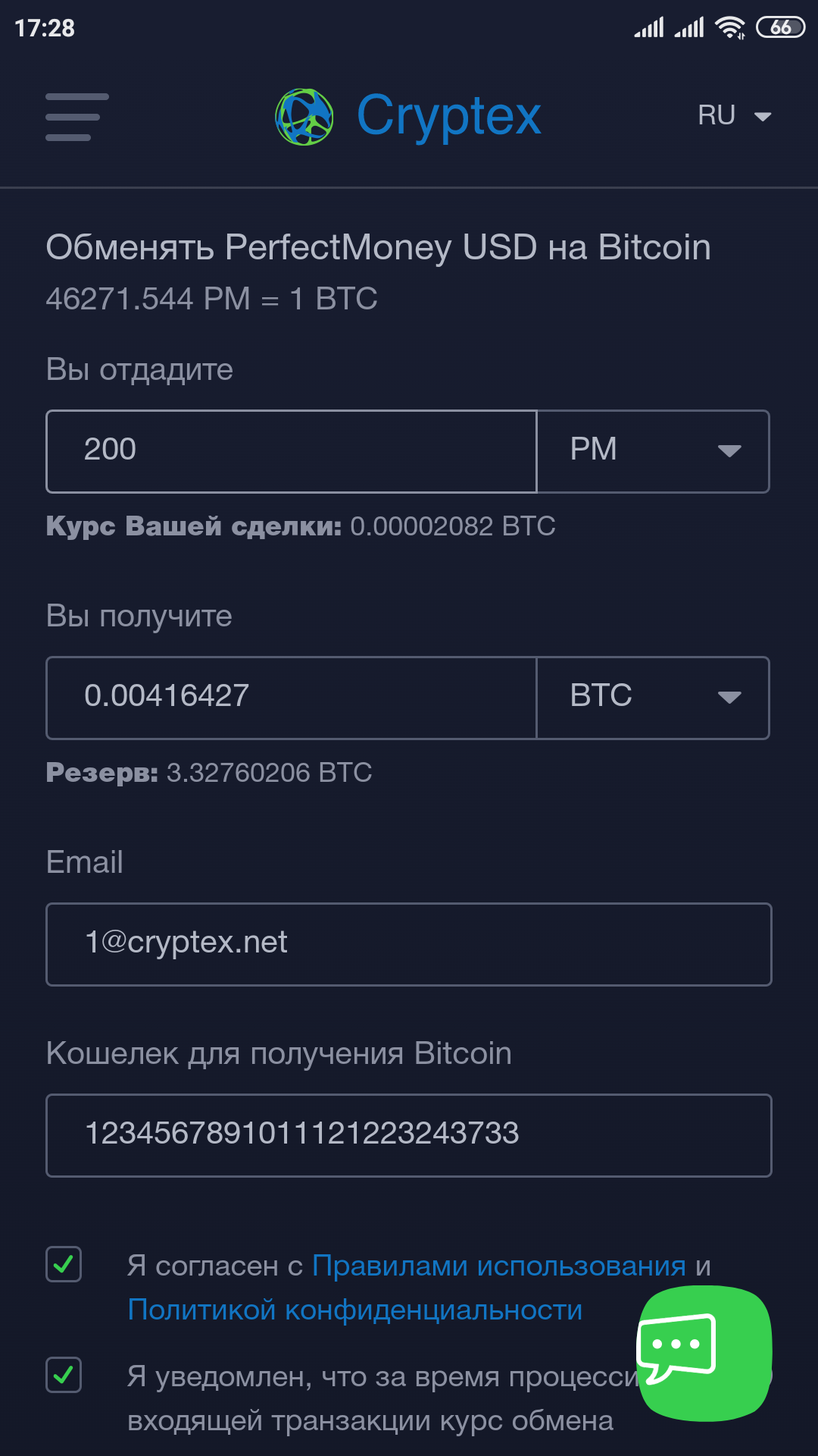 Обменные операции производятся по самому выгодному биржевому курсу. В большинстве случаев покупка или продажа происходит в автоматическом режиме. Например, обмен Perfect Money на любую из доступных криптовалют происходит почти мгновенно, а в обратном направлении достаточно дождаться трех подтверждений из сети блокчейна, и в тот же момент получить средства на счет платежной системы.