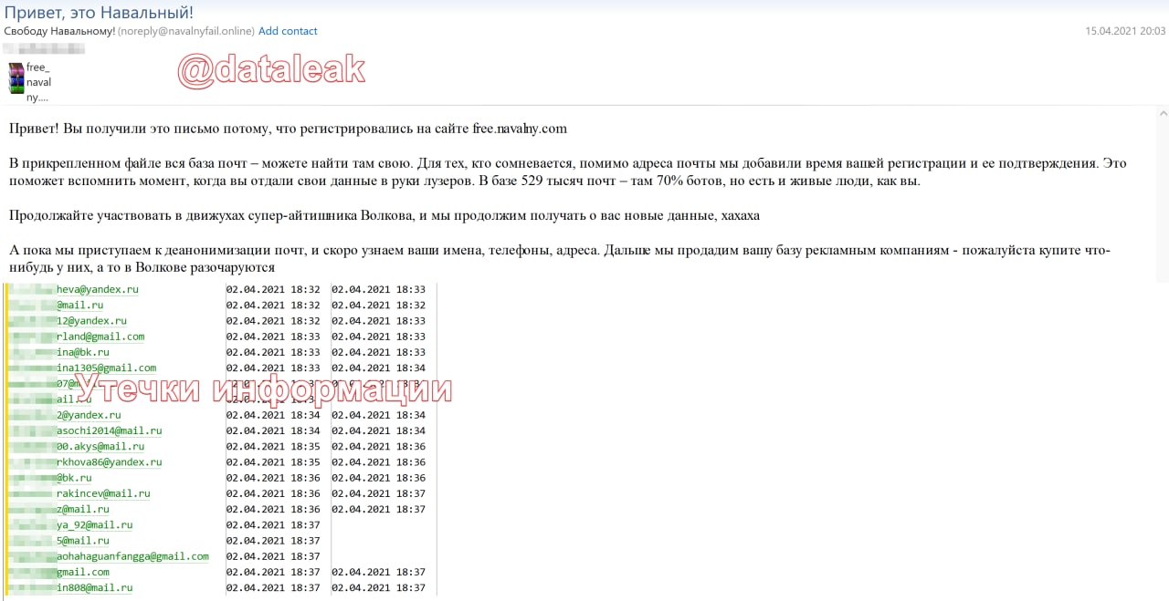 Неизвестные хакеры рассылают пользователям, зарегистрировавшимся на сайте «Свободу Навальному», архив с базой их электронных адресов. Об этом сообщает ряд Telegram-каналов. База содержит 529 570 строк адресов, зарегистрированных в период с 23 марта по 1 апреля. Хакеры утверждают, что “70% это боты, но есть и живые люди”. [caption id="attachment_131960" align="alignnone" width="1280"]