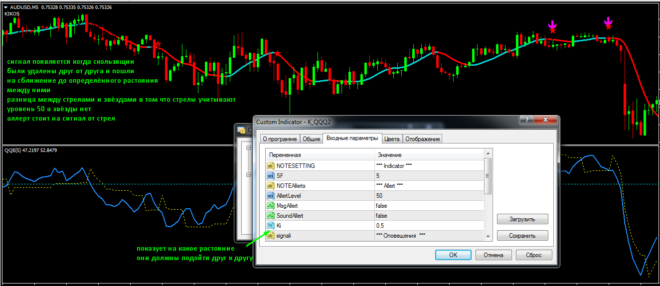 Не подскажите какие настройки нужно ставить? Кинул на график со стандартными - пусто, никаких сигналов.