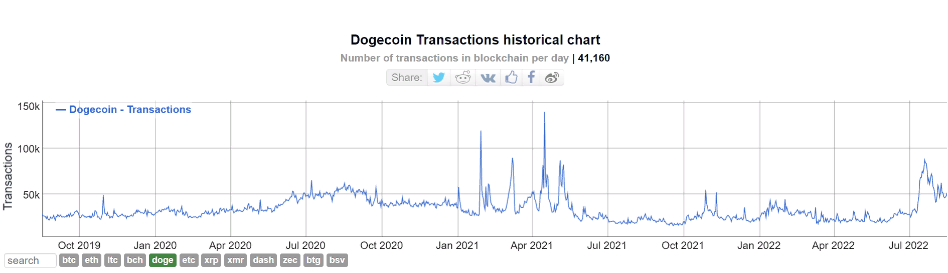 По данным BitinfoCharts, активность в сети Dogecoin возрастает. Среднесуточное число транзакций 17 августа достигло 51 180.