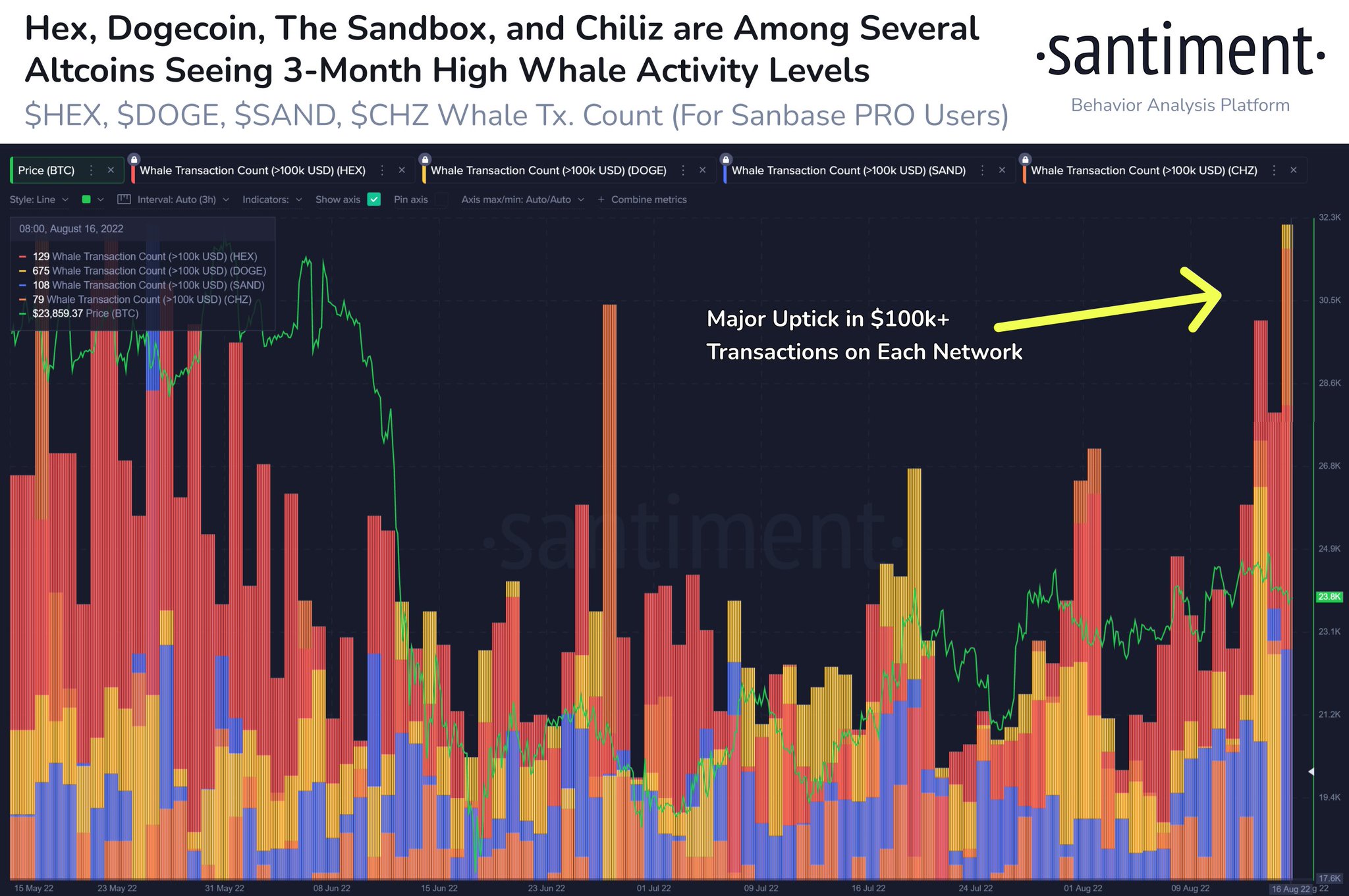 Команда Santimemt зафиксировала всплеск китовой активности в сети Dogecoin. На блокчейне резко возросло количество транзакций на суммы более $100 000. Крупнейшие адреса возобновили покупки после того, как DOGE достиг дна в районе $0,069.