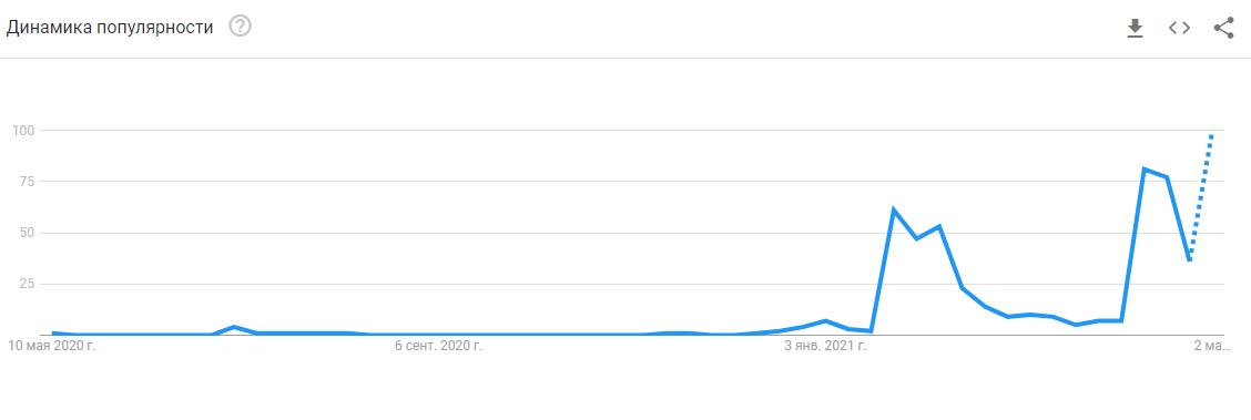 Первый всплеск произошел в конце января. Далее количество DOGE-запросов упало до минимума в начале марта. Следующий скачок произошел в середине апреля, именно тогда Илон Маск спровоцировал очередное ралли Dogecoin, анонсировав ее полет на Луну.