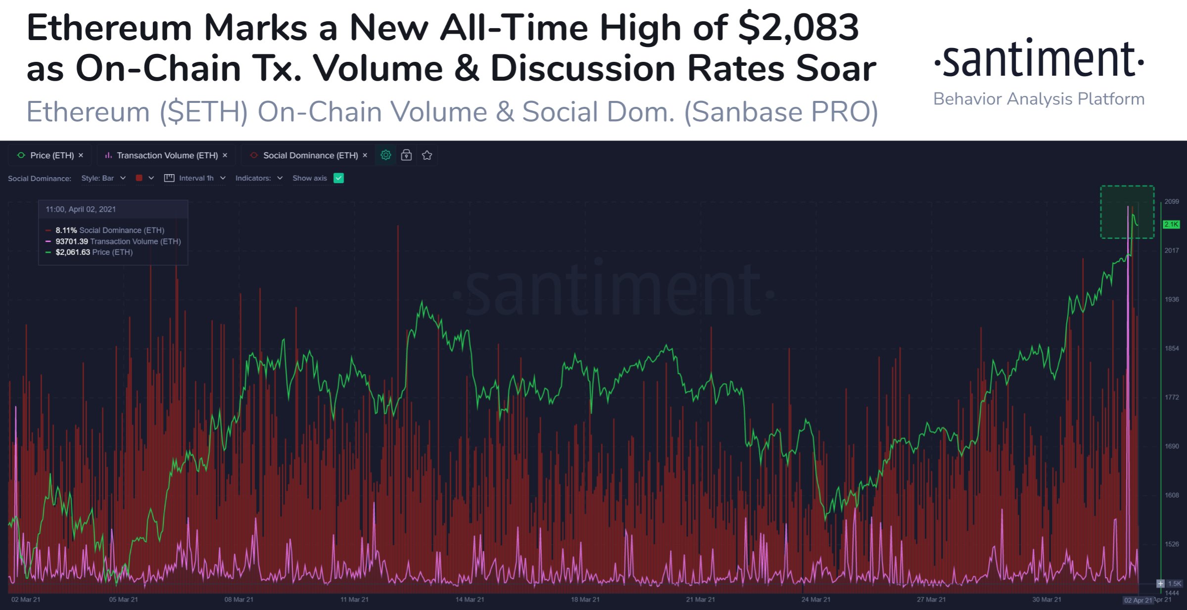 Аналитики Santiment отмечают, что очередной ценовой максимум наблюдается на фоне рекордной высокой сетевой активности. Эксперты считают, что отметка в $2000 станет важной зоной поддержки для эфира.