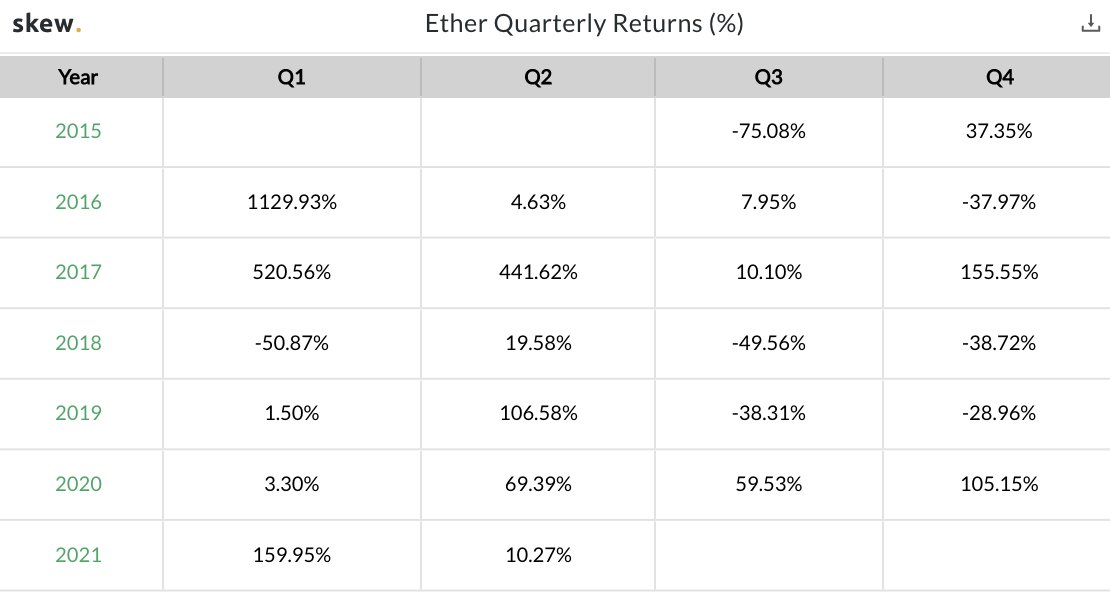 Самым результативным для эфира стал первый квартал 2021 года. По его итогам стоимость альткоина выросла почти на 160%.