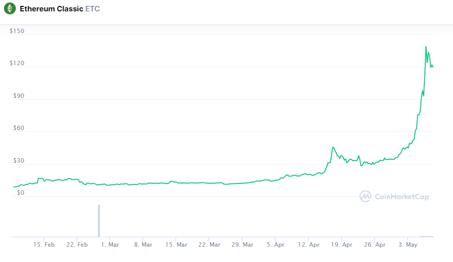 Примерно на 300% выросла стоимость альткоина Ethereum Classic (ETC) за последние семь дней. Монета накануне достигала $145 на некоторых торговых площадках - это максимальное значение в истории криптовалюты.