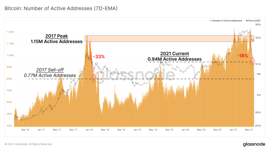 Сглаженный семидневной скользящей средней показатель активных биткоин-адресов сократился на 18% от недавних пиков — до ~940 тысяч. В 2018 году, после достижения цифровым золотом исторического максимума на тот момент, падение показателя составило 33%.