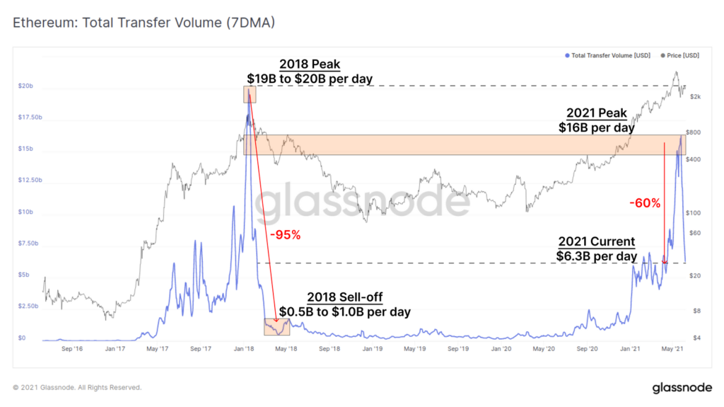 В сети Ethereum совокупный объем переданной ончейн-стоимости обвалился по отношению к многолетним максимумам на 60%. В 2018 году падение соответствующего показателя составило 95%.