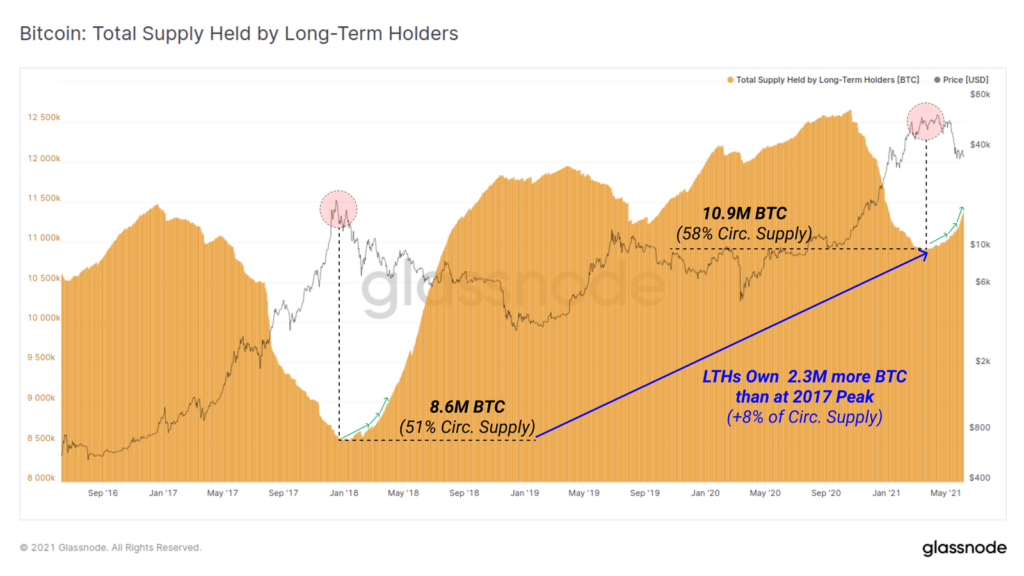 На долгосрочных держателей биткоина сейчас приходится 10,9 млн монет или 58% от рыночного предложения. Это на 7% выше по сравнению со значениями начала нисходящего тренда в 2018 году.