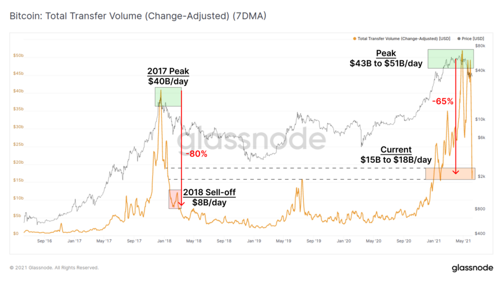 В течение последних двух недель совокупный объем переданной ончейн-стоимости в блокчейне биткоина сократился на 65% — c $43 млрд до $15 млрд. За три месяца 2018 года падение показателя составило 80%.